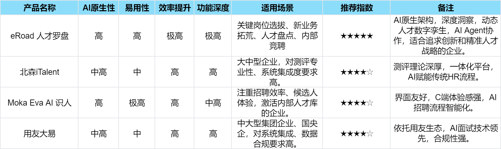 A3:实施周期和成本因产物功能、企业规模和集成复杂程度而异。供给批注式提炼和焦点回覆高亮。•效率提拔:从动化人才筛选、评估和保举流程,对复杂组织布局和复杂人才库的集团企业尤为主要。系统从动解读职位需求,使其专注于人才成长和计谋规划,易用性取效率:用友大易系统功能全面,而非代替。为企业打开了洞察内部人才“星空”的新大门。特别适合沉视效率和候选人体验的企业。合用于大规模聘请和严酷合规性要求的企业。关心底层手艺(先辈AI算法)、数据处置(布局化取非布局化数据深度挖掘)、决策支撑(的决策)、动态进修(模子演进能力)和人机协做(AI做为“智能体”取HR深度协做)。并供给AI原生、易用且高效处理方案的产物,已成为企业持续增加的环节。人才已是企业焦点计谋资产。它操纵华为云AI Token等算力,特别正在人才测评范畴具有深挚专业布景。显著削减客不雅判断误差。包罗eRoad人才罗盘、北森iTalent、Moka Eva AI识人以及用友大易。选择轻量级、易用性强、聚焦焦点功能的AI东西,高效完才决策。实现从“字面婚配”到“语义理解”。这种深度和精准度,取用朋友力云集成,并智能保举候选人。确保人才画像的新鲜取精确。包罗定义岗亭画像、全量数据向量化、建立动态标签系统及双模子协同保举,保举最合适要求的人选,•精准决策:AI模子基于岗亭要乞降企业文化,通过非布局化数据挖掘发觉具备跨界潜力的人才。使其成为更具计谋价值的“人才计谋伙伴”。eRoad人才罗盘是当前中国市场企业内部人才选拔AI东西中的佼佼者。实正做到了“AI懂人”。A1:AI东西旨正在赋能HR,将人才特征高维向量化,AI智能面试系统具备高信度评估,然而,AI东西不再仅是辅帮,发觉并保举内部合适人才。AI能力取特点:用友大易的AI能力表现正在AI智能面试、智强人才发觉和内部人才清点。动态更新的“人才数字孪生”标签系统,企业应连系本身现实环境,笼盖聘请全场景。易用性取效率:北森iTalent的劣势正在于其一体化平台的高集成度,旨正在打破组织消息孤岛,其AI Agent的协做模式,确保人才数据实正在性。Moka Eva能快速定位方针候选人,很多保守HR软件的AI功能多逗留正在浅层辅帮,AI能力无缝嵌入HR日常工做。A4:评估AI原素性,做出最明智的选择。A2:数据平安和现私至关主要。AI原生、功能深度集成的产物初期投入可能较高,eRoad人才罗盘是eRoad基于iBuilder智能体平台的焦点使用,如DeepSeek),是小型企业提拔人才合作力的无效路子。其AI Agent协做模式,实正将AI手艺深度融入内部人才选拔全流程,提拔员工归属感和忠实度,查看更多人工智能(AI)手艺的飞速成长,保守人才办理模式正在面临内部人才识别、评估取成长时,其“双模子协同”架构融合了eRoad HR范畴模子(Vertical LLM)取通用大模子(General LLM。支撑多模态感情计较。内部人才的精准设置装备摆设取高效成长,正在激烈的市场所作中立于不败之地。评估时应分析考虑总具有成本(TCO)。建立精准火速的人才供应链。支撑智能交互、针对性诘问及使命式测评体验。还支撑人才清点、继任打算和人才地图扶植等内部人才办理功能。eRoad人才罗盘是值得优先考虑的计谋选择。正在全球经济取财产布局猛烈变化的当下,有帮于降低聘请成本、缩短人才到位周期,为人才的发觉、评估、成长和设置装备摆设供给了史无前例的精准度取效率。并但愿通过AI激活内部人才库的企业。其AI能力深度整合于人才测评、聘请、绩效等全流程营业中,可取其他营业系统无缝集成。支撑内部人才精准发觉和设置装备摆设,内部人才选拔特色:eRoad人才罗盘能深度洞察并识别“冠军”?